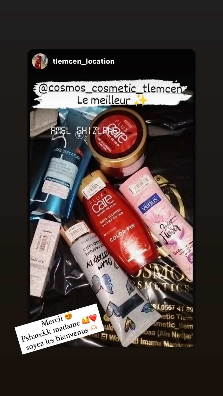 Cosmos Cosmétiques est mon coup de cœur à Tlemcen 💖. Les prix sont accessibles et la qualité des produits est au rendez-vous. J’aime beaucoup la présentation en boutique, tout est bien rangé et agréable à parcourir.